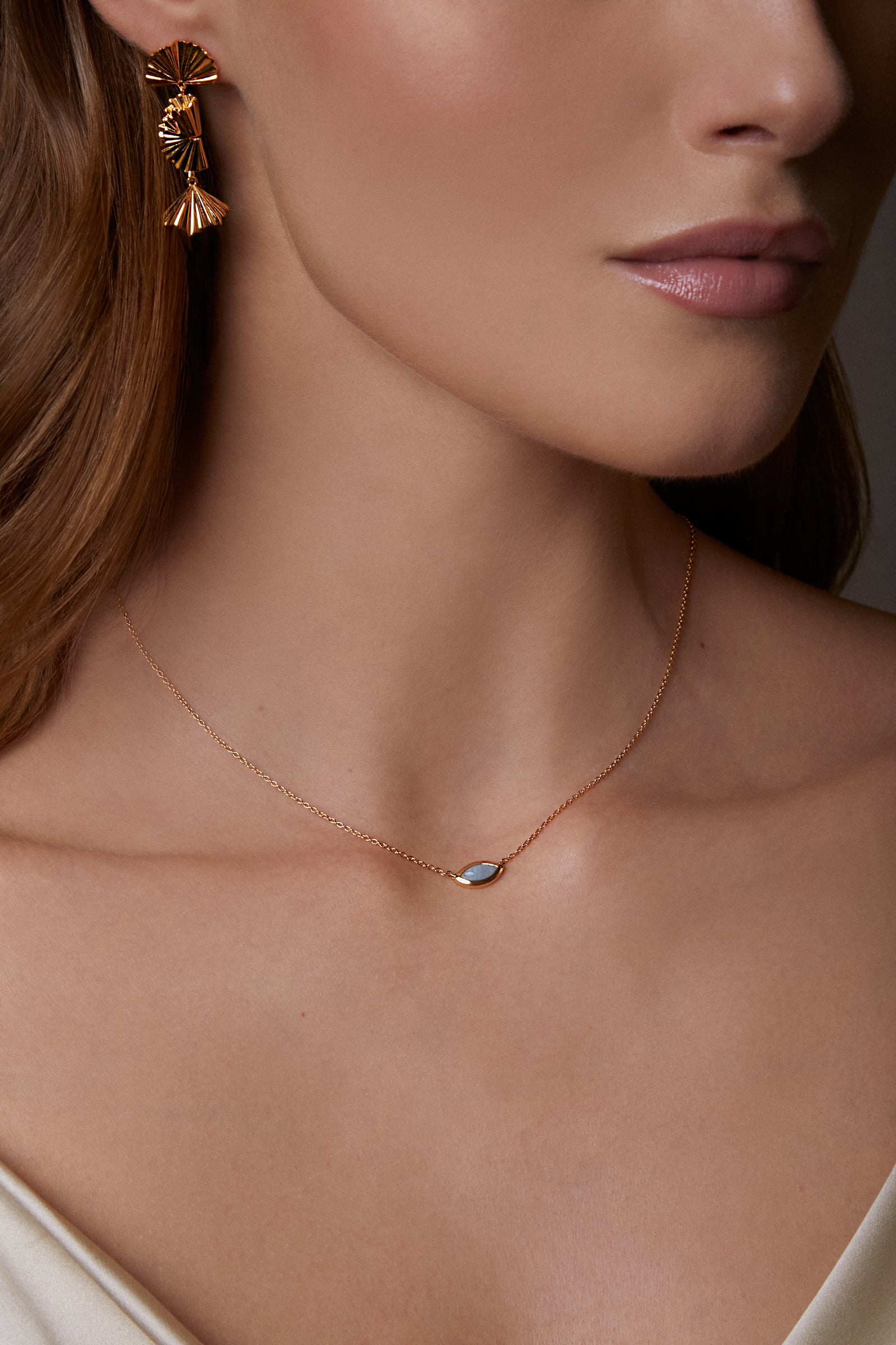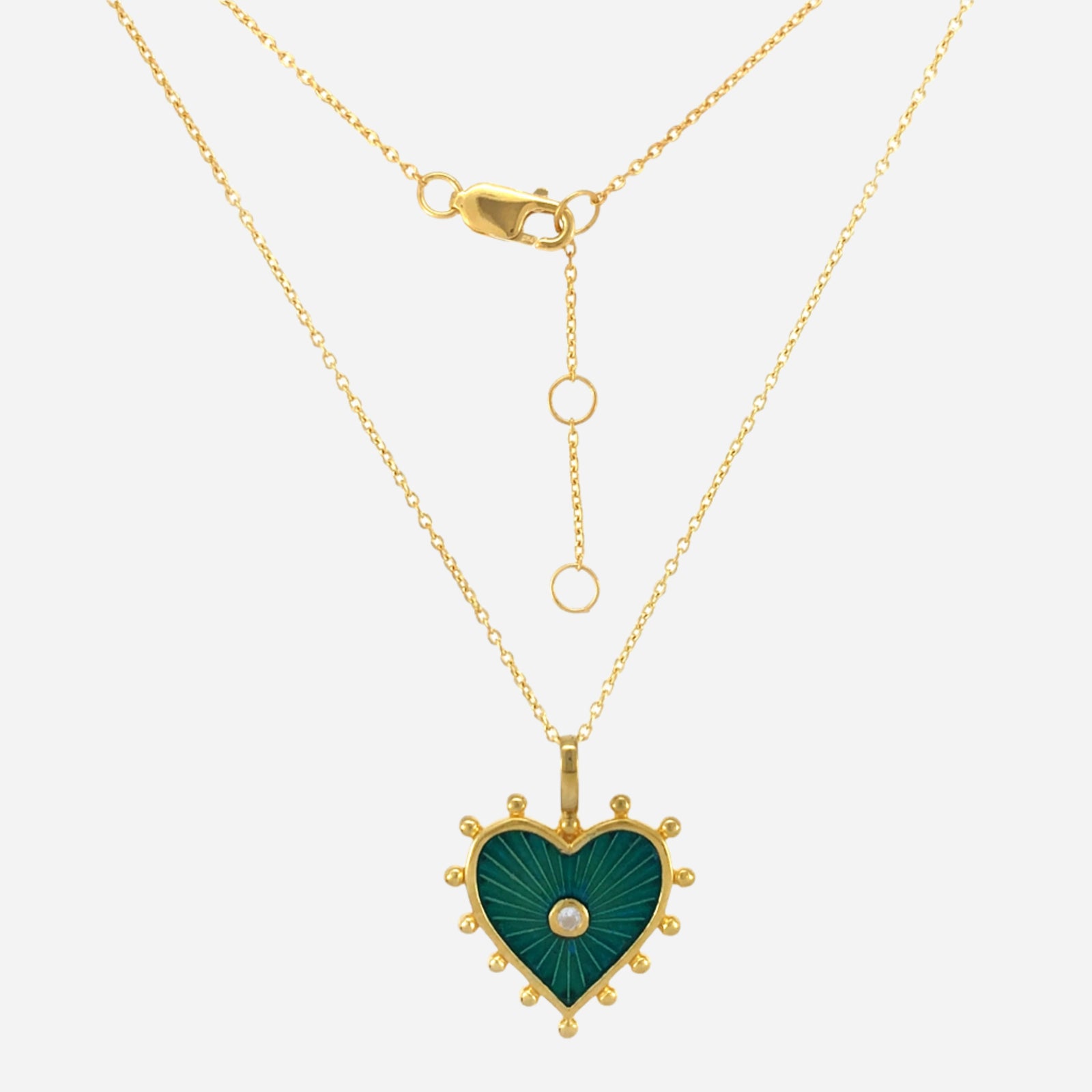 s h o pDiscover our Aveline necklace, a stunning piece that beautifully combines elegance and charm. This exquisite necklace features a heart-shaped charm adorned with vibrant teal enamel, perfectly complemented by a sparkling White Topaz centre stone.
