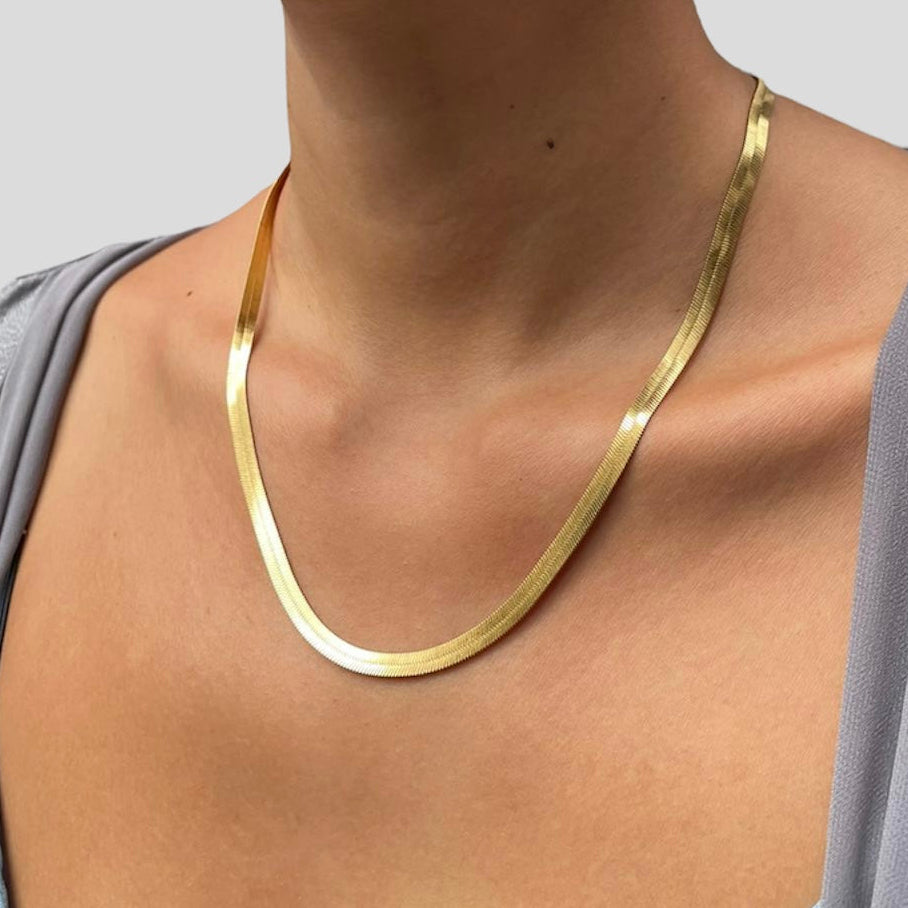 This herringbone necklace is crafted from sterling silver and finished with a layer of gold vermeil. The gold finish gives the necklace a beautiful warm golden hue, and the thick layer of gold plating ensures long-lasting durability.