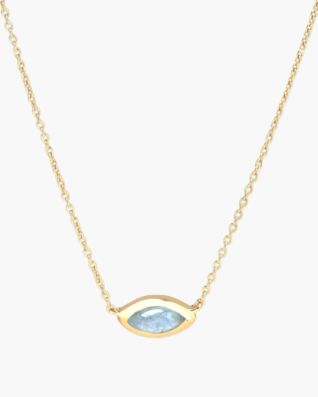 Introducing our elegant chain necklace featuring a captivating evil eye aquamarine charm. Crafted from gold vermeil sterling silver, the chain provides a dainty and sleek foundation for the charm. The aquamarine charm dazzles with serene blue hues, symbolizing tranquility and clarity. Treat yourself or someone special to this timeless accessory, embodying grace and positive energy.